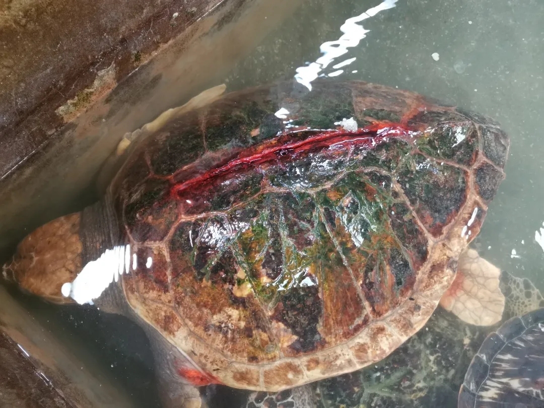 其中一只红海龟左后肢被咬断,仅剩一点残肢,背甲上更有长达三十厘米、深可见肉的伤口,周围附着顽固的牡蛎。经过日复一日的红药水涂抹,伤口已在逐渐愈合。隔壁池中的一只玳瑁,背甲被渔网严重刮伤,且由于长期无法进食,咀嚼功能受损,正从接受管饲鱼肉糜,逐渐过渡到练习自己吞咽小鱼。