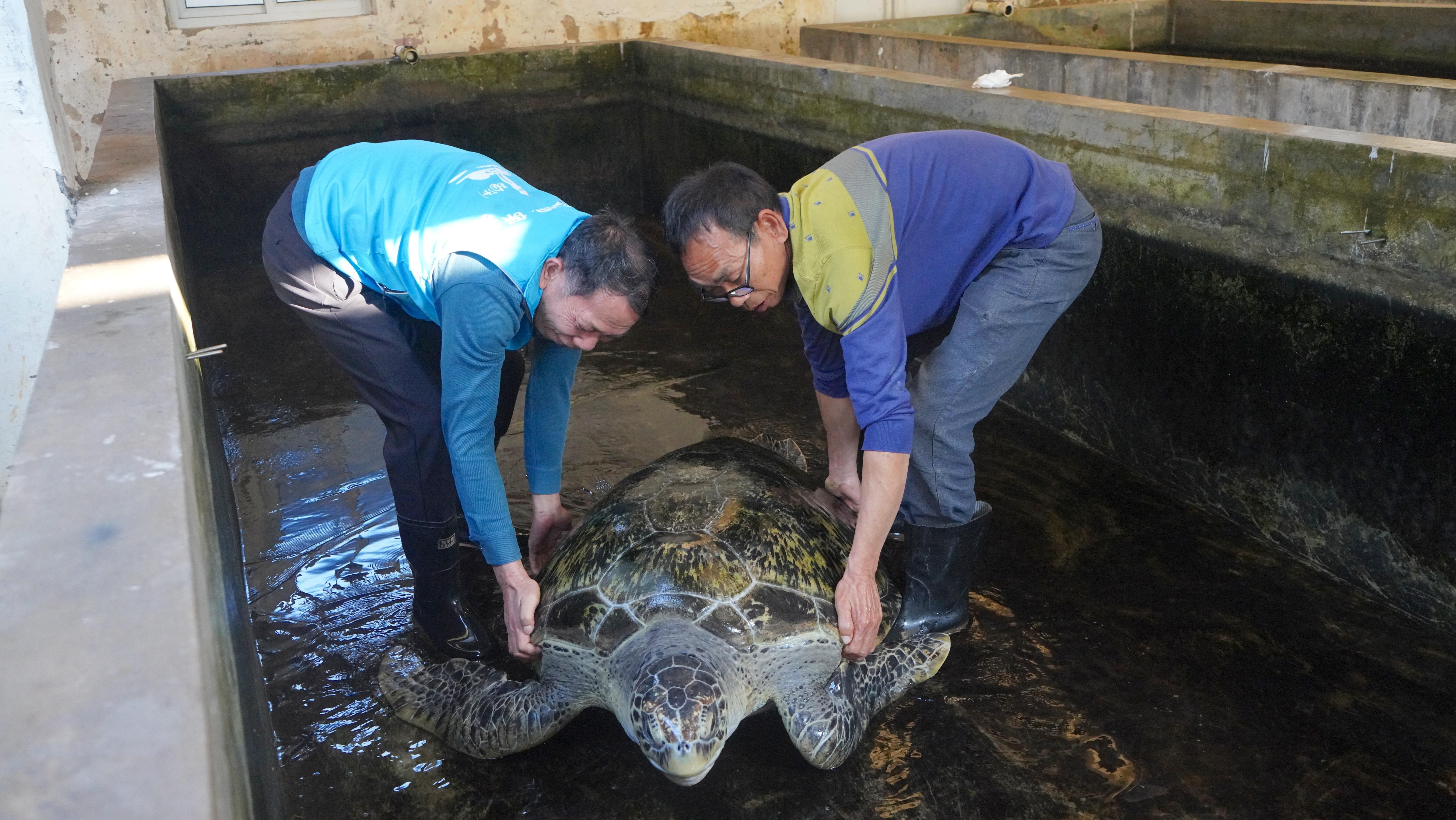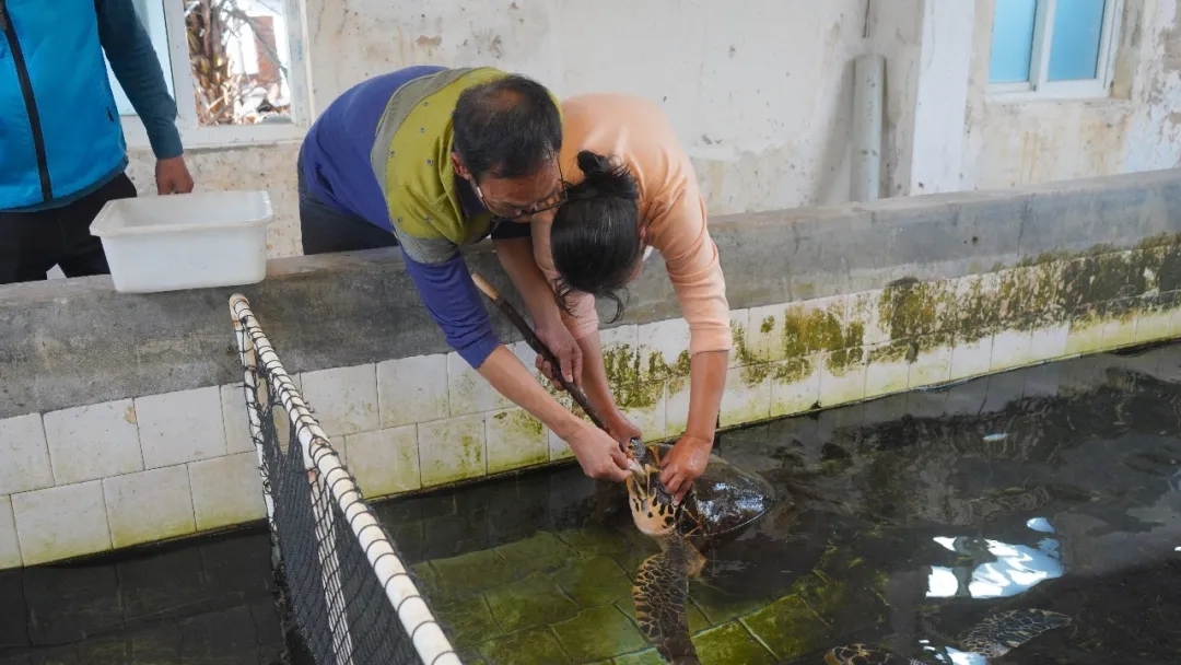 “刚来时它非常虚弱,体重只有现在的一半。”刘振强说。基地为它制定了专门的康复方案。伤口清理、浸泡消毒、注射抗生素……最初几个月,它连自主进食的力气都没有,工作人员便将鱼肉打成糜,通过软管一点一点喂给它。他们还用特制的消毒药水,小心为它擦拭背甲,既是为了伤口消炎,也是为了防止牡蛎等生物附着在裸露的创面上。