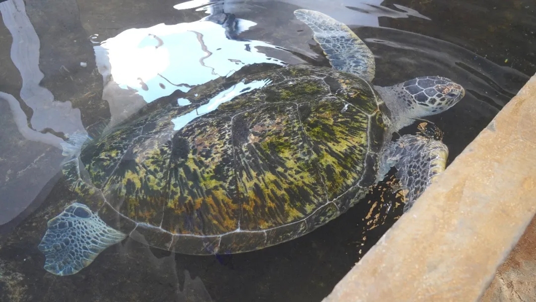由于无法自由觅食,它曾被严重的营养不良折磨,甲壳上还附着了一层坚硬的牡蛎。初抵基地时,工作人员花费了巨大心力为它清理甲壳,至今那些被寄生生物侵蚀留下的孔洞依然清晰可见。“现在精神好多了,体重也从一百来斤涨到了两百多斤,只是它可能再也没有能力回到野外独自生活了。”梁爱洲顿了顿,语气里满是遗憾。